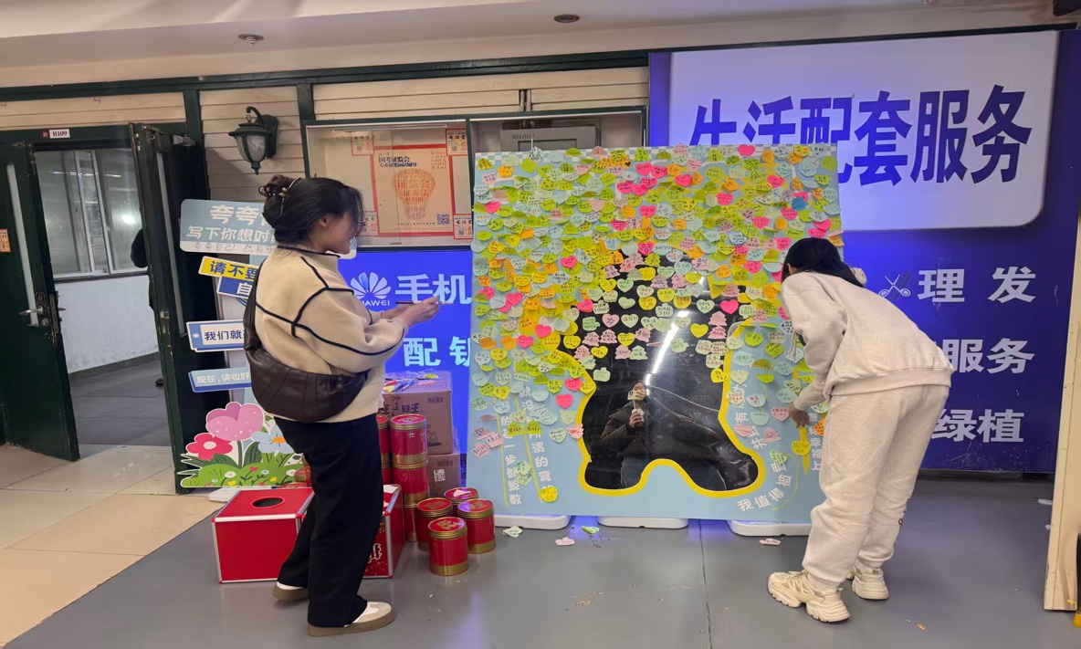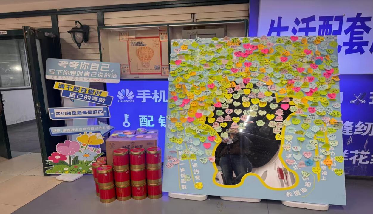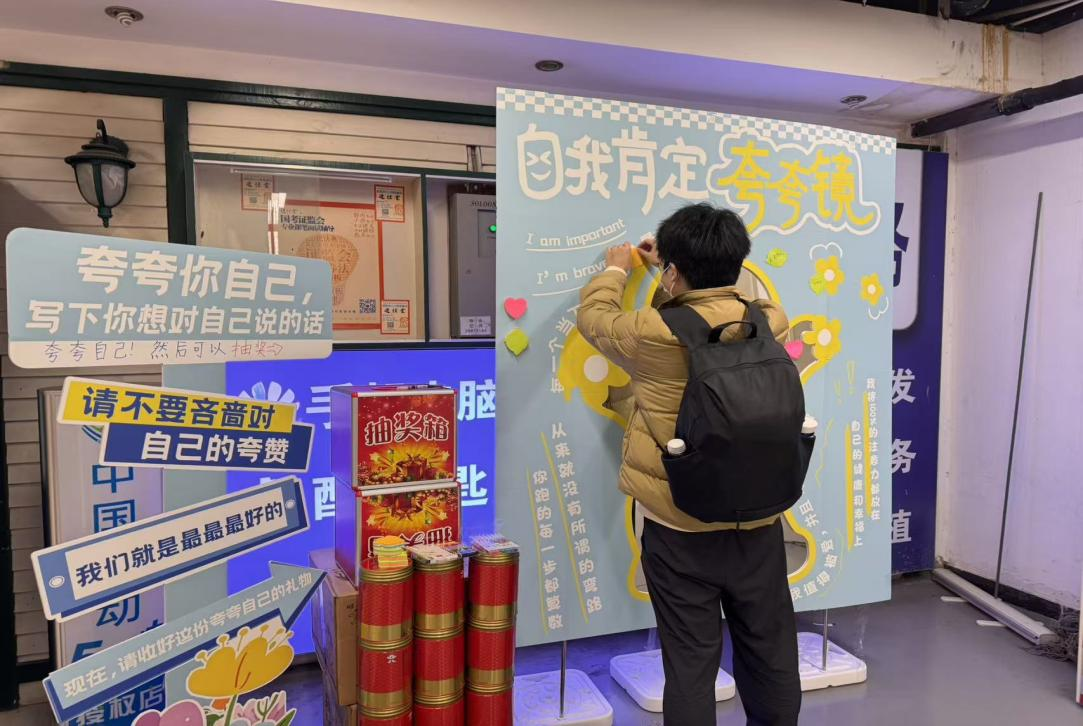 本次活动在海淀校区新一号楼 B1设置“夸夸镜”互动区。同学们可以在特制的“夸夸镜”前驻足,大声地鼓励自己、欣赏自己。同时,同学们可以在一旁的便签上写下对自己的鼓励或赞扬的话语,亲手将这些“肯定”贴在展览海报上面,汇聚成一面积极的能量墙。此外,本次活动还设置了抽奖环节,参与人可以抽取专属的“幸运饼干”,饼干包装有不同的鼓励话语,为大家带来惊喜和力量。活动以一种温暖而有力的方式,帮助学生发现自身闪光点,传递积极心理暗示,实现自我赋能。